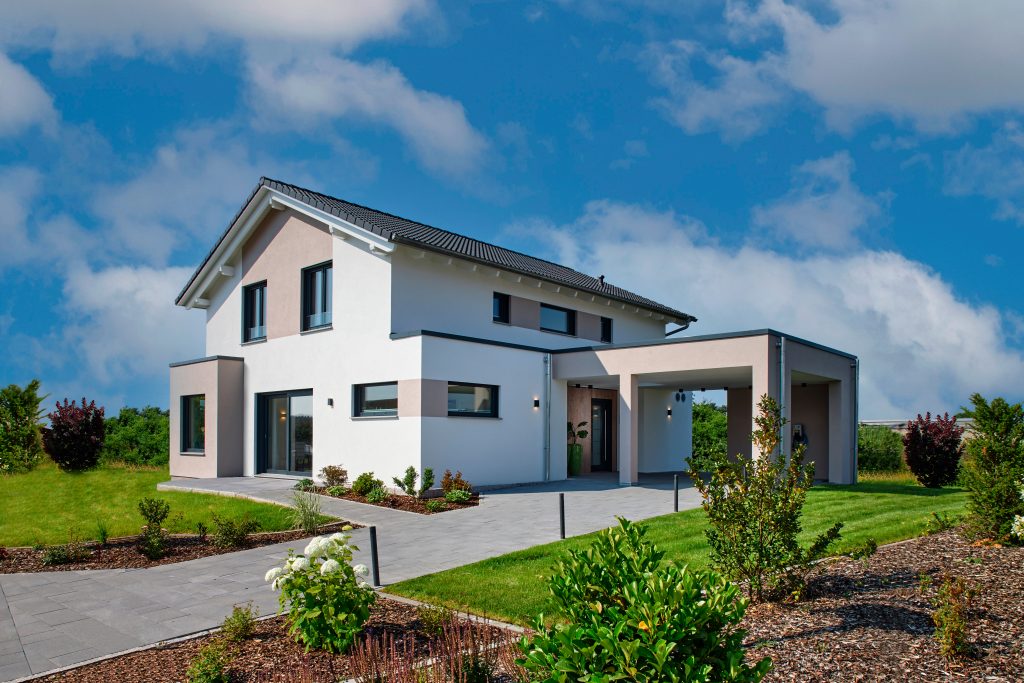 Das Musterhaus „Palermo“ können sich Bauinteressenten in der FertighausWelt Nürnberg bei Heßdorf anschauen. Auf über 170 Quadratmetern Wohnfläche ist für große Familienbereiche sowie gemütliche Rückzugsorte gesorgt. Highlight: Ein Erker mit Sitzfenstern über Eck beim Essbereich sowie ein Dachfenster im Carport, das den Eingangsbereich von oben erhellt.