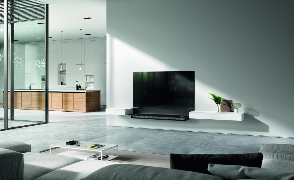 Einrichtung mit bereits integrierter Technik ist ein weiterer, innovativer Ansatz. Das kann zum Beispiel eine induktive Ladestation fürs Smartphone auf der Möbeloberfläche oder eine integrierte Docking Station zur Musikwiedergabe sein. Der Fokus der „smart furniture“ liegt meist auf dem in einem Möbelkorpus installierten Soundsystem. Die Steuerung der vielfältigen Features erfolgt über eine App. Die Entwicklungen im Smart-Home-Bereich zeigen, dass Home Entertainment nicht mehr nur im Wohnzimmer stattfindet, sondern genau dort, wo wir möchten und wie wir möchten. Es ist Zeit, Beamer und Leinwand aus dem Keller zu holen!